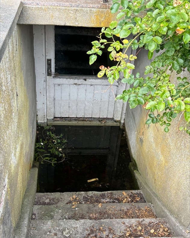 Ejendommens kælder står under vand og har derfor ikke kunne besigtiges nærmere. Det er oplyst, at ejendommen har stået tomt. Der er lukket for vand og el. Der er normalt en kælderpumpe, som er blevet slukket i forbindelse med lukning af strøm, og dette har bevirket, at der står ca. 15 cm vand i hele kælderen. Det er oplyst, at det skulle være en rørskade fra 1. sal, som ikke er blevet udbedret.