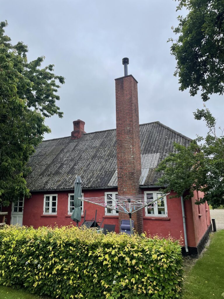 Ejendommen er opført i mursten og med fibercement herunder asbest som tagdækningsmateriale.