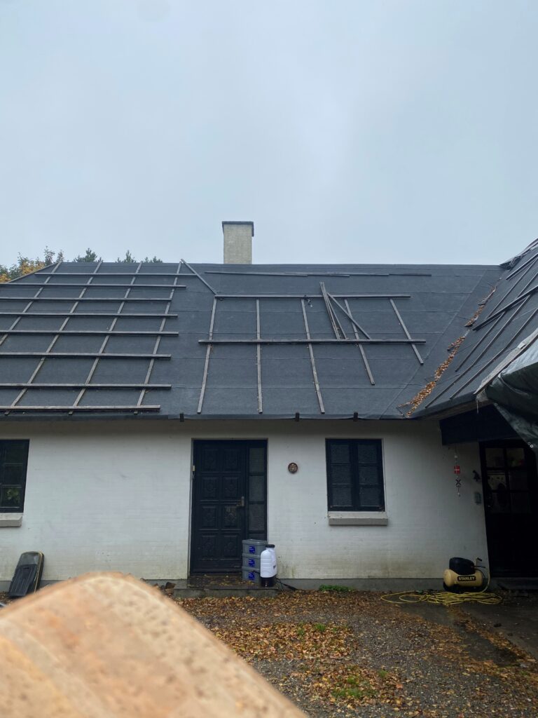 Huset er et pudset hvidt hus. Taget på den ene ende af husets vinkel er ikke færdiggjort, hvorfor noget står med presenning på. Huset har en dobbeltcarport.