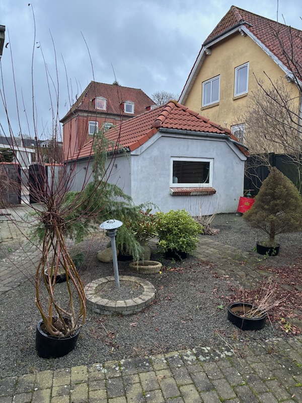 Ejendommen har desuden en 30 m² garage med elektrisk port og en have med flere terrasser.