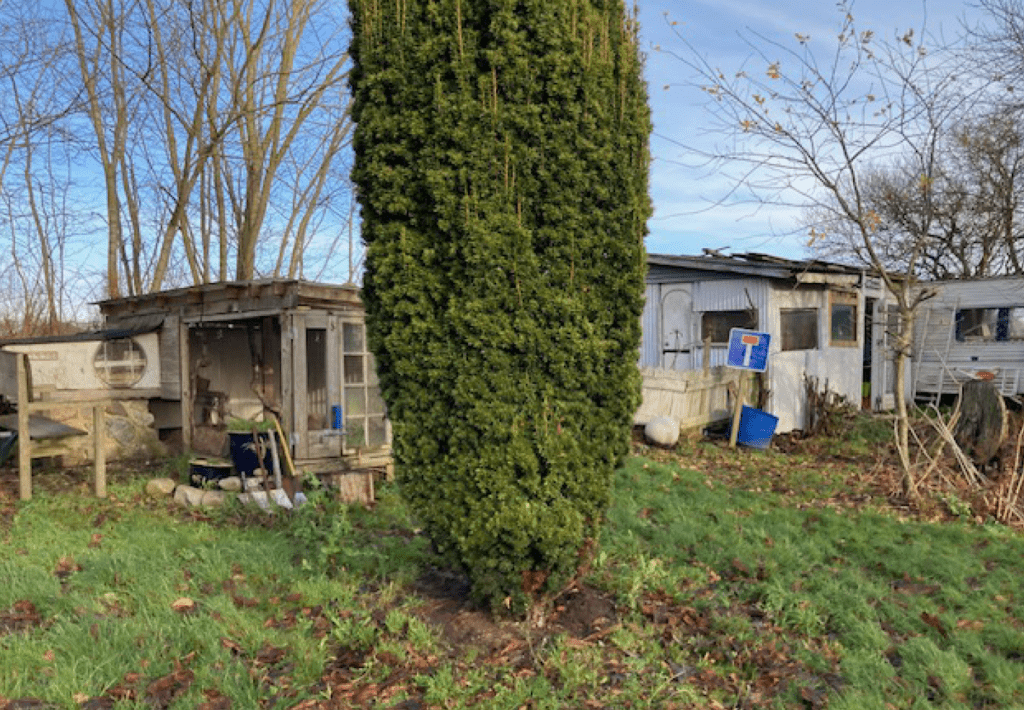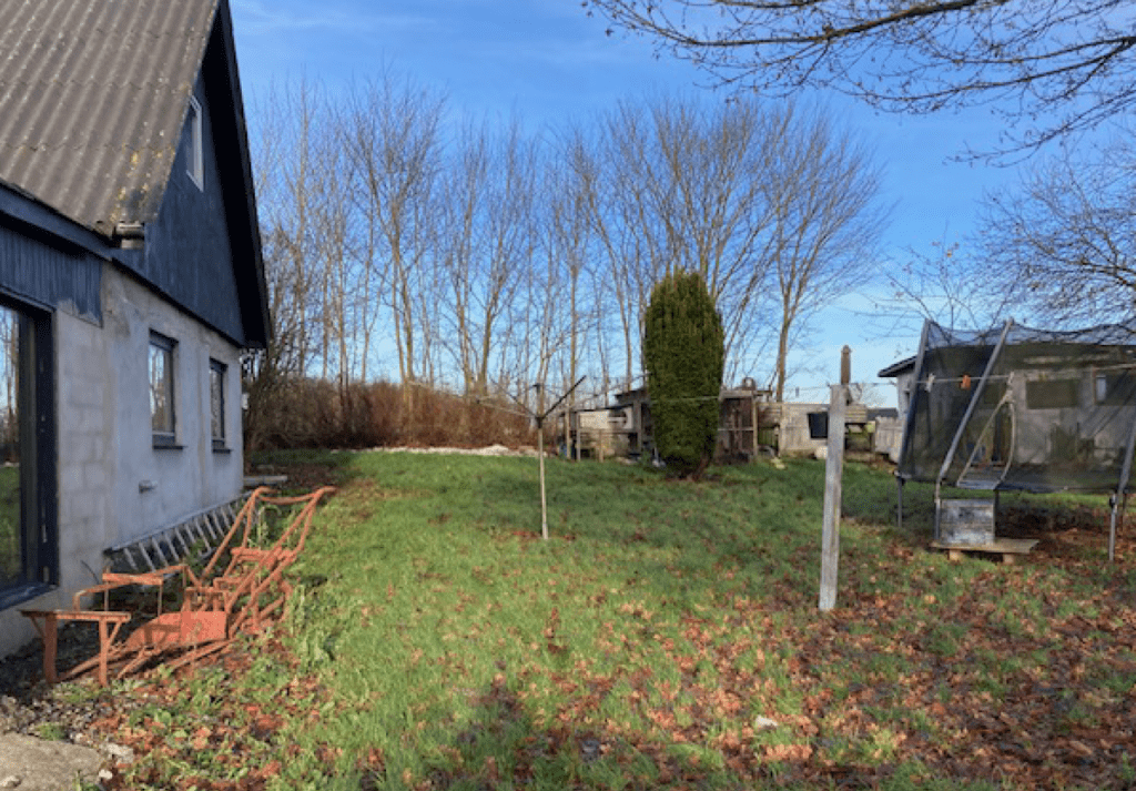 Ejendommen har en gårdsplads og have. I haven er der græsplæne med gyngestativ, trampolin, sandkasse, legehus, hønsehus og drivhus. Derudover er der to campingvogne der er bygget sammen med tag og vægge. Ydermere er der et redskabsskur lavet af stål. Nærværende bygninger/konstruktioner er ikke omfattet i BBR.