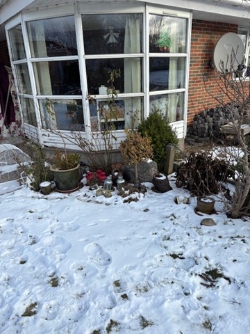 Bag ejendommen er der stor have med græsplæne, kaninbure, fuglevoliere og overdækket fliseterrasse. Der er en træterrasse bag carporten. I haven står endvidere et spabad, som ifølge ejer ikke virker.