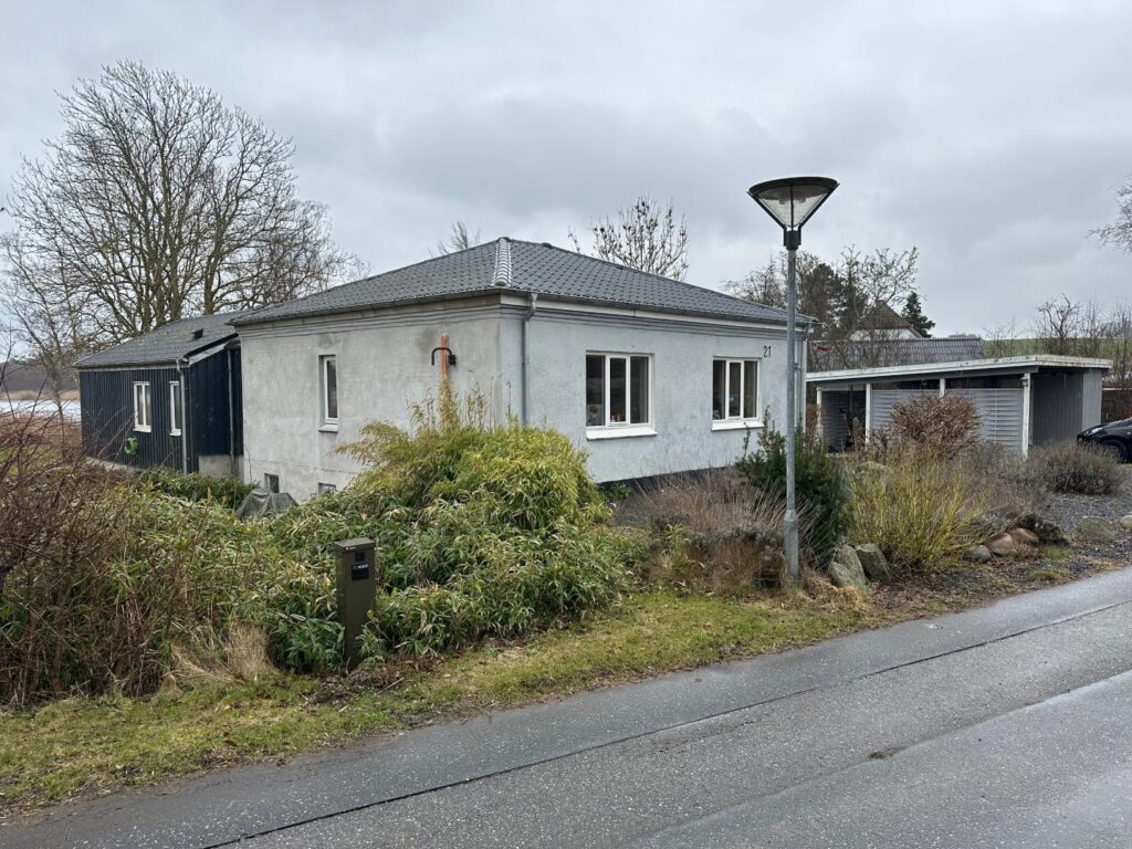 Ved indkørslen til ejendommen ankommer man til en grusbelagt plads med plads til flere biler. Herefter følger en carport med plads til to biler. I tilknytning til carporten er der to skure med hver sin hvide trædør. Carporten er opført i gråmalet træ og har metaltag. Træbeklædningen omkring carporten op mod taget har grønne algebelægninger.