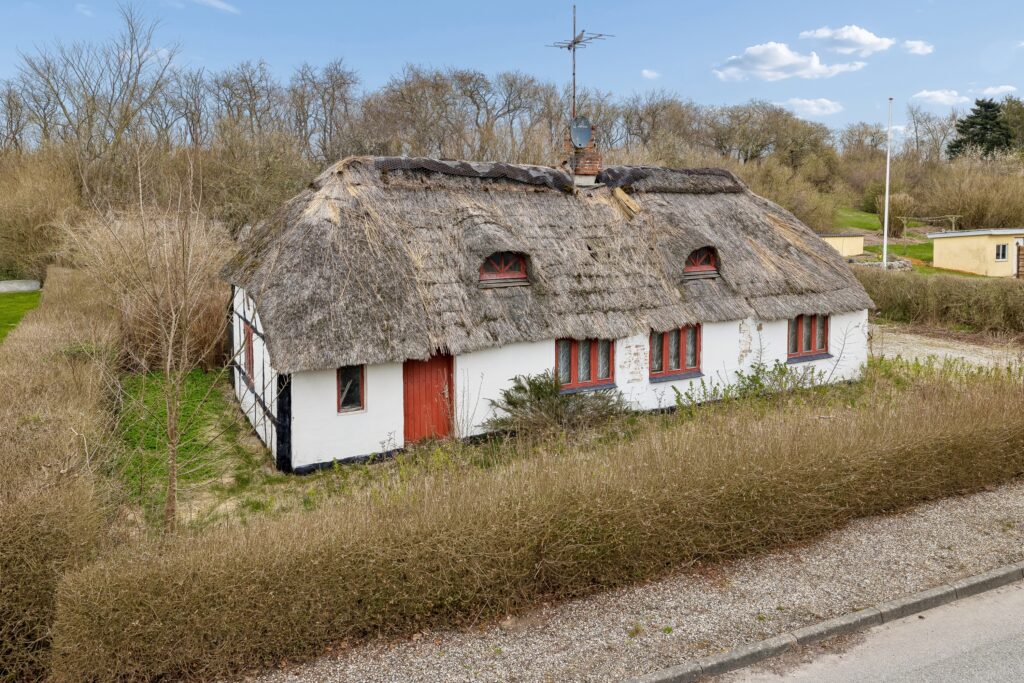 Ejendommen fremstår med hvidpudset facade, delvist kombineret med synligt bindingsværk på gavlen og stråtag.